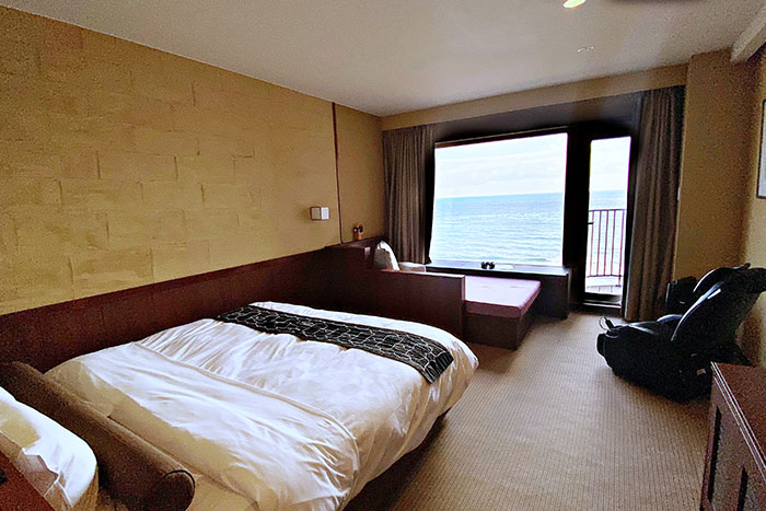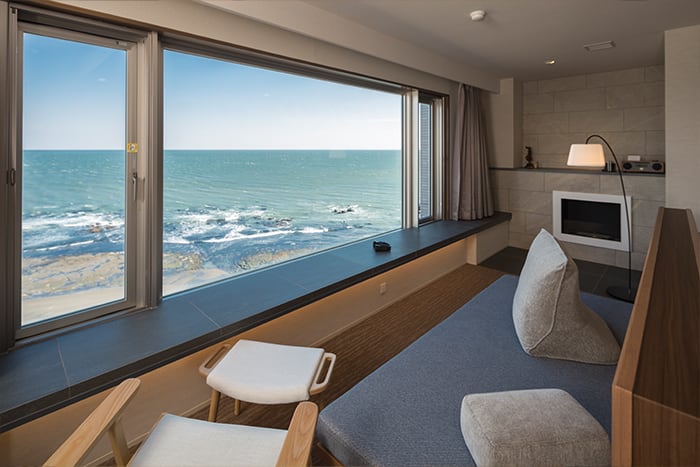 大きく落とした開放的な窓に太平洋を一望するプライベートテラスが付いた和室です。畳に座りながらも寛ぎながら海を眺められます。